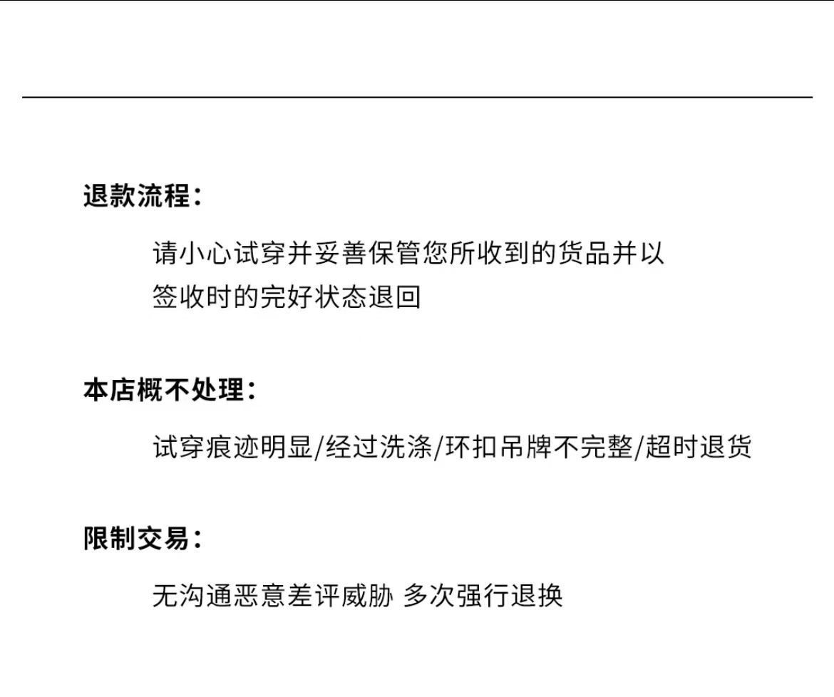 小店非七天无理由店铺不支持退,同款支持换码一次,如有问题请及时与我们沟通,谢谢。